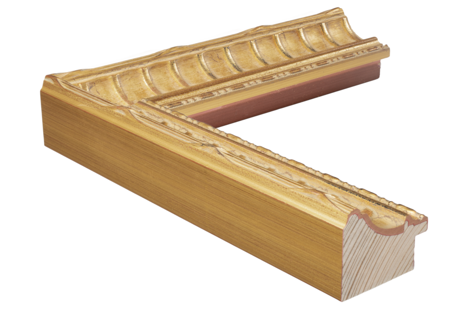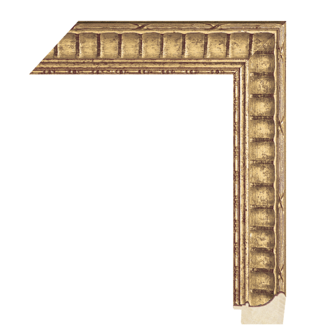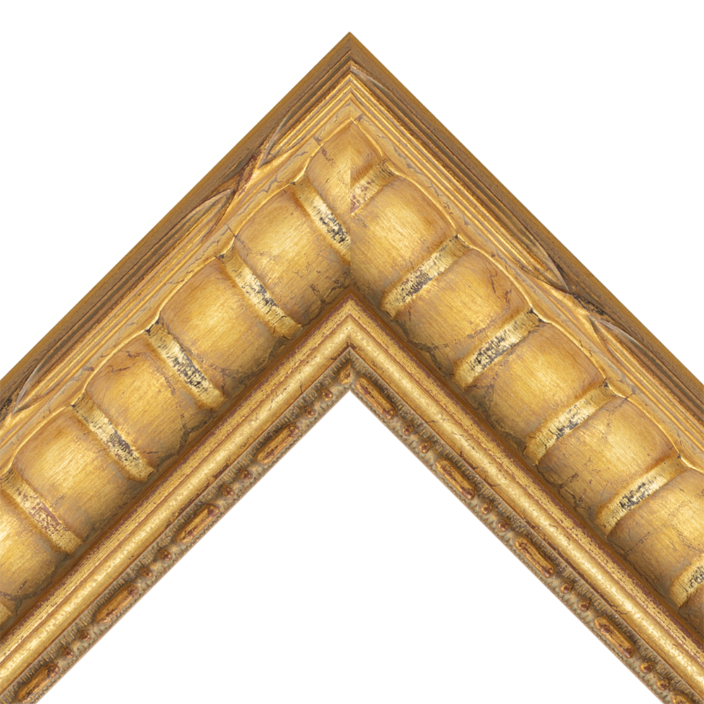 The Elizabeth is a richly detailed gold moulding featuring deep scooped curves, ornamental ribbed texture, and distressed gilded highlights. This handcrafted frame measures 2” wide x 1 ½” high with a 5/8” rabbet, offering both strength and elegance in presentation.